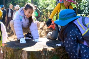 チームごとに自然観察をしながら植樹場所へ移動。切り株の年輪を数え、「この木は148歳!」と驚きの声。